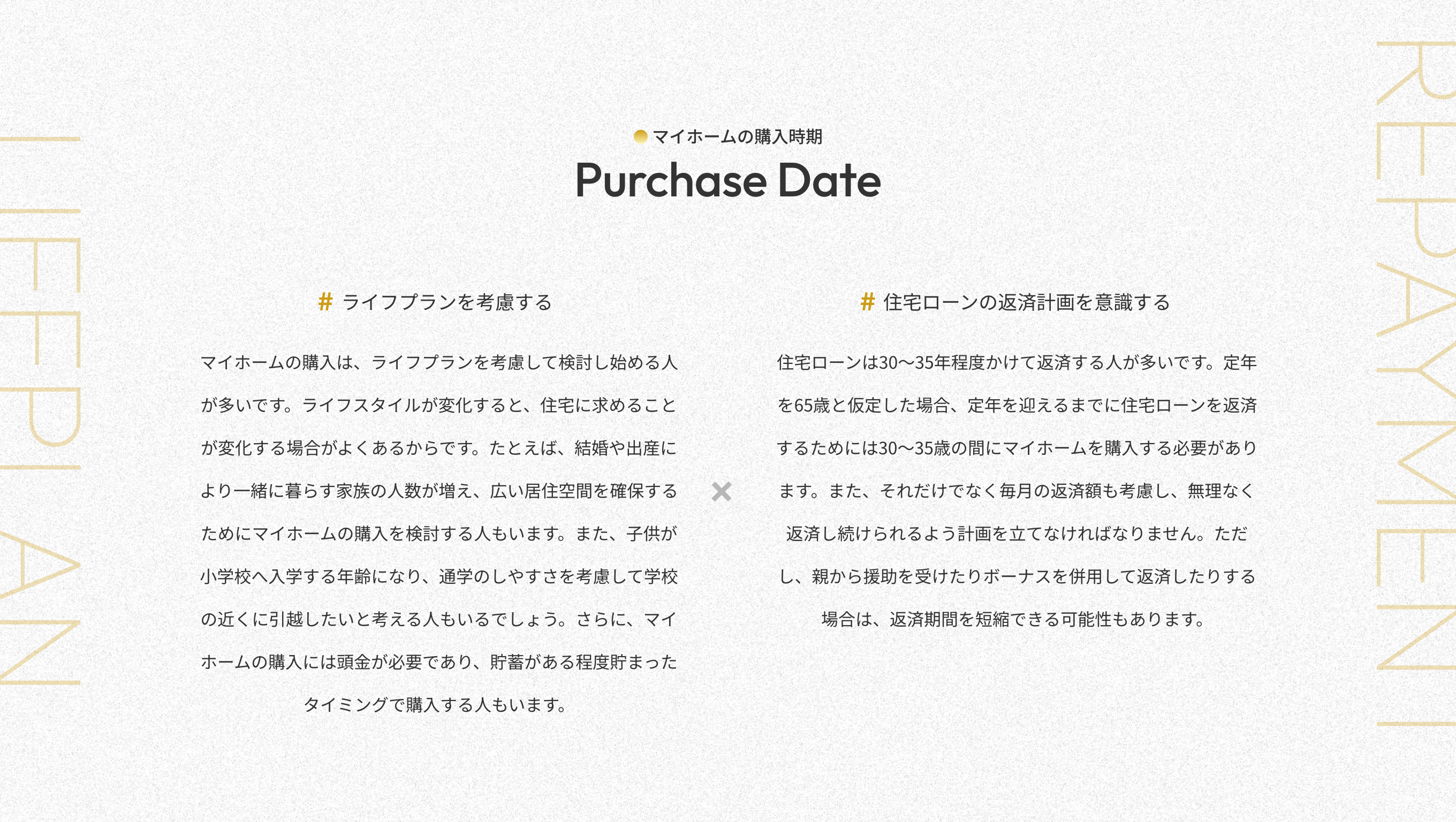 住宅ローンは30~35年程度かけて返済する人が多いです。定年を65歳と仮定した場合、定年を迎えるまでに住宅ローンを返済するためには30~35歳の間にマイホームを購入する必要があります。また、それだけでなく毎月の返済額も考慮し、無理なく返済し続けられるよう計画を立てなければなりません。ただし、親から援助を受けたりボーナスを併用して返済したりする場合は、返済期間を短縮できる可能性もあります。