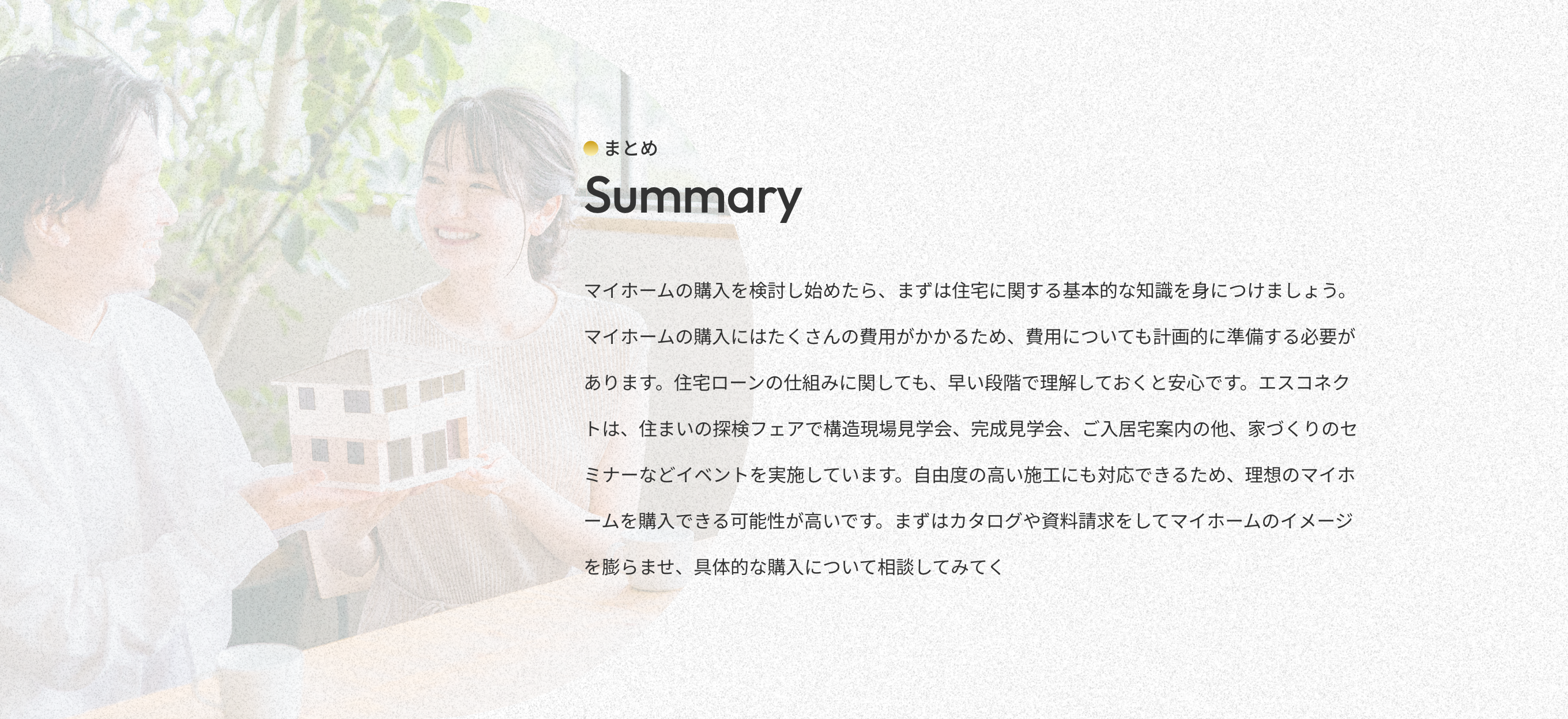 マイホームの購入を検討し始めたら、まずは住宅に関する基本的な知識を身につけましょう。マイホームの購入にはたくさんの費用がかかるため、費用についても計画的に準備する必要があります。住宅ローンの仕組みに関しても、早い段階で理解しておくと安心です。エスコネクトは、住まいの探検フェアで構造現場見学会、完成見学会、ご入居宅案内の他、家づくりのセミナーなどイベントを実施しています。自由度の高い施工にも対応できるため、理想のマイホームを購入できる可能性が高いです。まずはカタログや資料請求をしてマイホームのイメージを膨らませ、具体的な購入について相談してみてください。